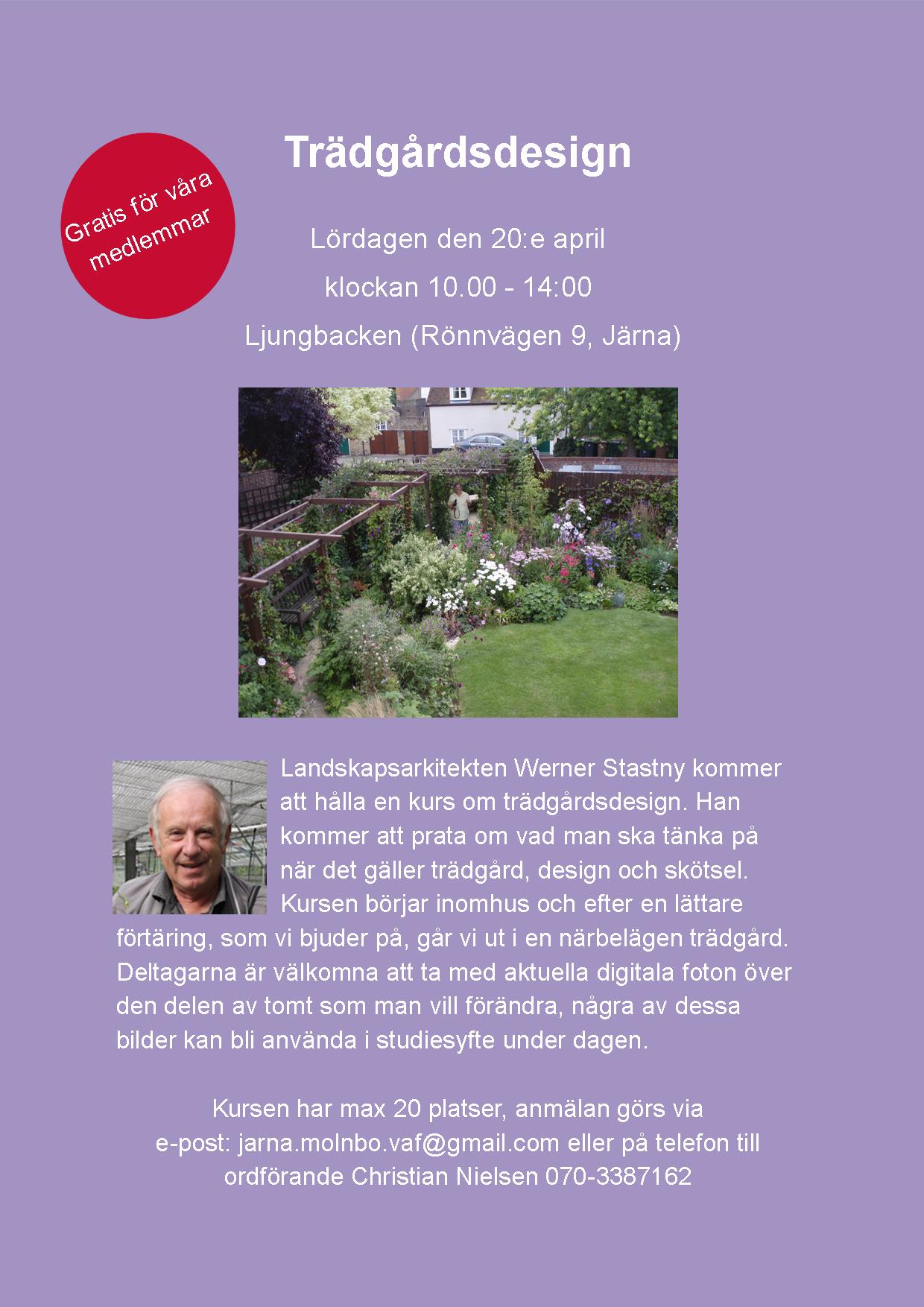 Landskapsarkitekten Werner Stastny kommer att hålla en kurs om trädgårdsdesign. Han kommer att prata om vad man ska tänka på när det gäller trädgård, design och skötsel. Kursen börjar inomhus och efter en lättare förtäring, som vi bjuder på, går vi ut i en närbelägen trädgård. Deltagarna är välkomna att ta med aktuella digitala foton över den delen av tomt som man vill förändra, några av dessa bilder kan bli använda i studiesyfte under dagen.